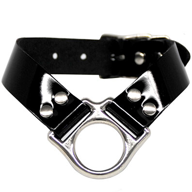 Patent Leather collar with a halter ring. Lays flat for a sexy fashion accessory or can be used with a leash.