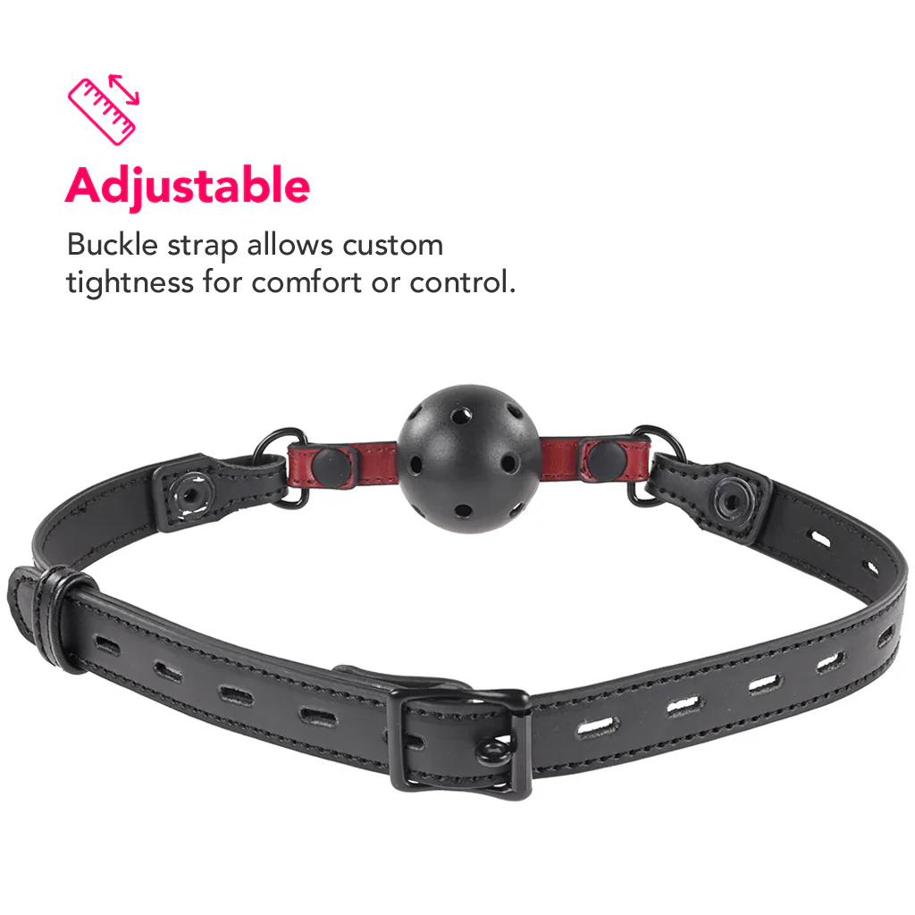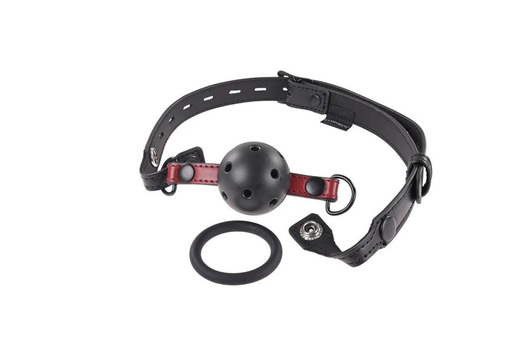 Add the “shhhh” to sultry with bright scarlet accents on a black satin finish. Luxurious faux leather and your choice of bite ring or breathable ball gag make the Saffron Interchangeable Gag a versatile must-have for any bondage collection. Simply unsnap each side of the gag to change out pieces for multiple ways to play.Features: