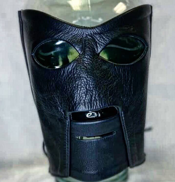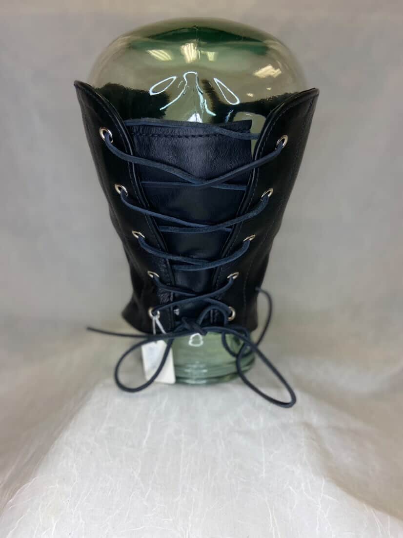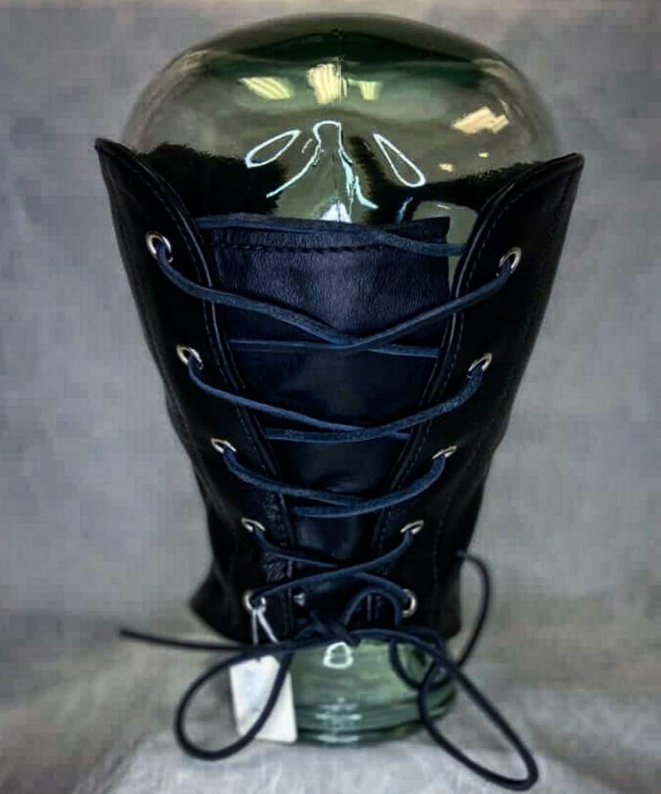 Made from genuine leather, this hood has open head, eyes and nose. There are laces in the back for size adjustment to maximize the perfect fit.