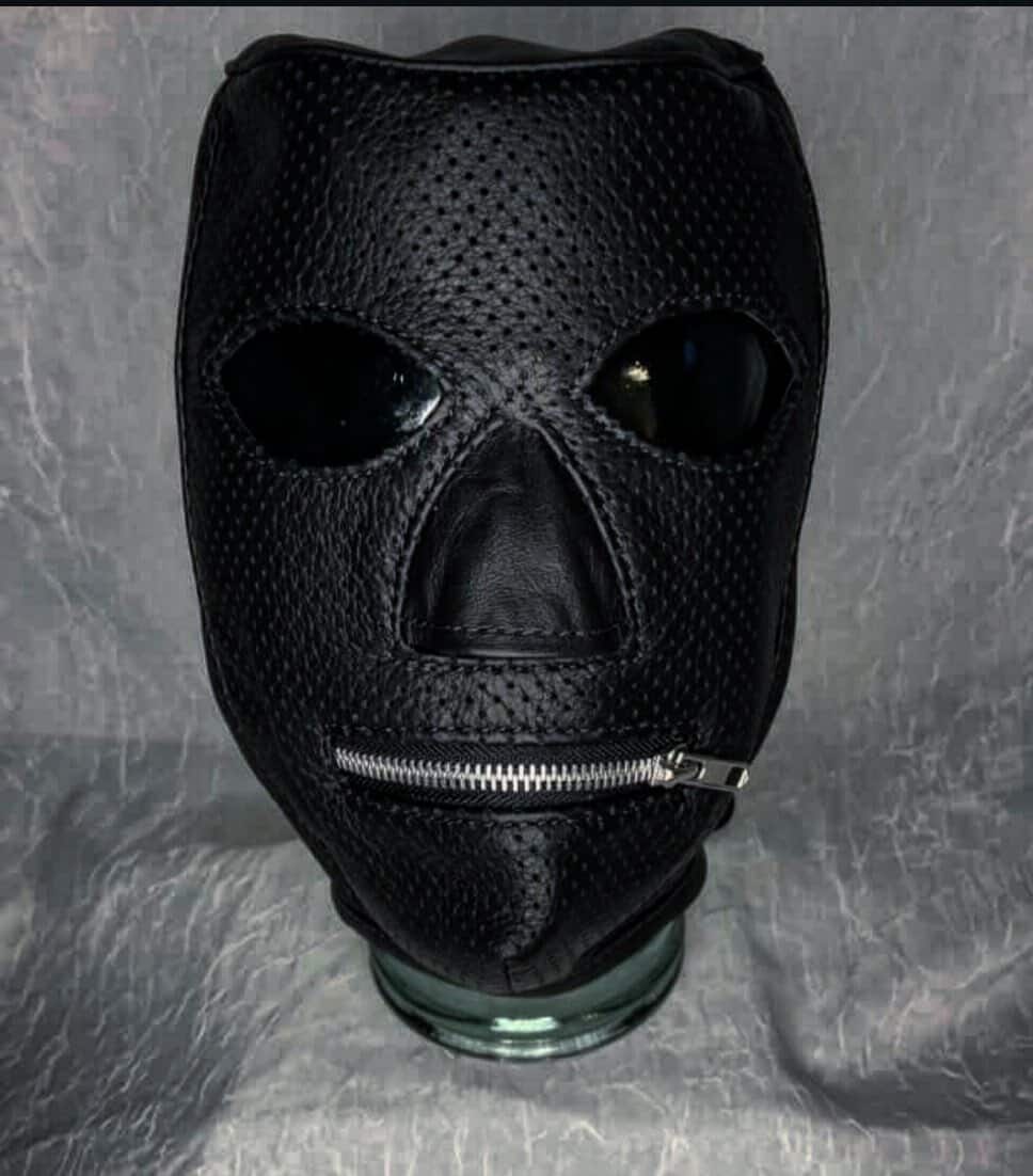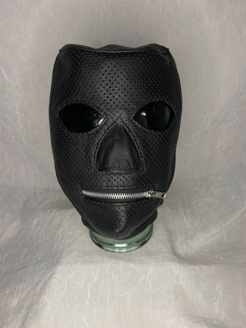 Perforated leather slave hood with zipper mouth, open nose. There are laces in the back for size adjustment to maximize the perfect fit.