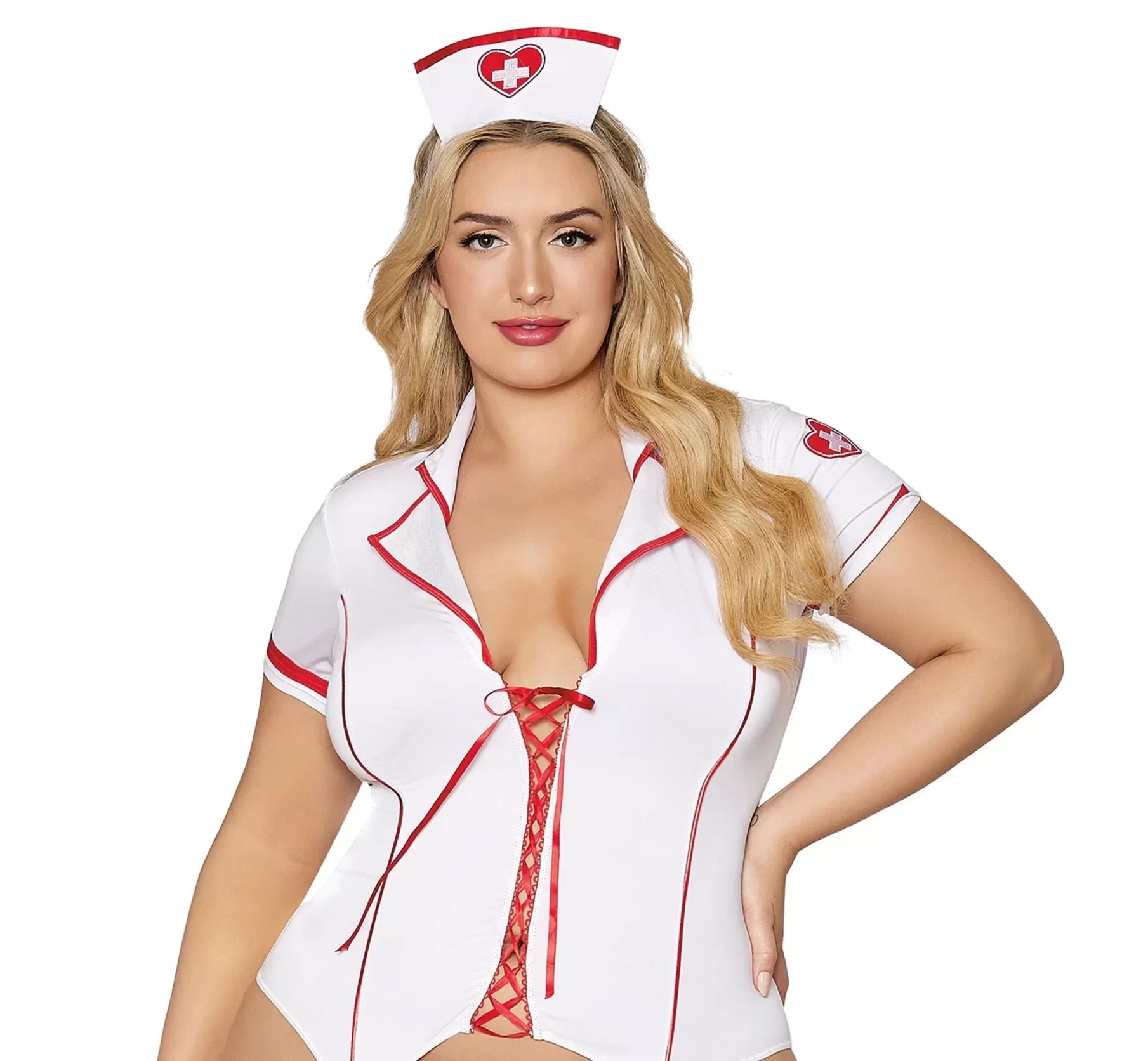 Stretch jersey and stretch mesh short sleeved garter slip with contrast piping and lace-up ribbon front, contrast back ruffles, and attached adjustable garter straps. Matching G-string and nurse cap included. Thigh Highs sold separately.